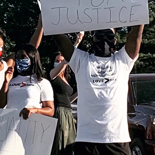 LOVE>hate believes in the power within each human to unite and inspire others to take action in their communities to put a stop to hate. The "End of Racism" tee is a constant reminder that WE ALL have work to do.